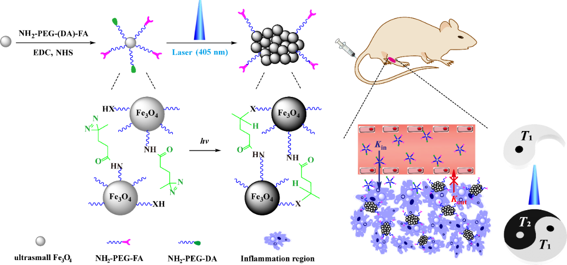 针对上述技术难点,在本项研究工作中,研究团队构建了具有光触发组装的超小铁团簇用于关节炎的增强靶向和动态T1/T2 MR成像。主要设计思路如下:利用水热合成法制备具有较高r1弛豫率的超小氧化铁纳米颗粒,之后修饰上聚乙二醇化的光响应分子(PEG-DA)和聚乙二醇化的靶向分子(PEG-FA),得到的纳米平台能在405nm 激光照射下交联团聚,并获得具有精准可调r1和r2弛豫率的超小铁团簇;经静脉注射超小铁纳米颗粒后,超小尺寸使其能更容易在关节炎周围血管中渗出进入炎症区,靶向分子使其能更容易在炎症区聚集,实现关节炎处的增强T1 MR成像;之后在激光照射下能引发超小铁纳米颗粒交联成团簇,从而阻止团簇再进入血液循环,实现其在关节炎处的分级靶向聚集,达到增强滞留的双模态T1/T2 MR成像。结合光触发组装和分级靶向策略可使得纳米平台有效的绕过大部分生物障碍和增强其在目标区域的滞留,该策略对绝大多数疾病具有普适性,不受特定生物环境因素限制,因为大多数疾病(如炎症、肿瘤等)都可利用光控制实现时空上操作的统一。