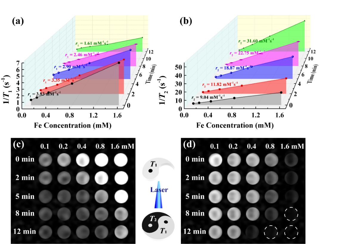 (激光照射不同时间后形成的超小铁团簇的r1/r2弛豫率及其相应的>T1/T2 MR成像)