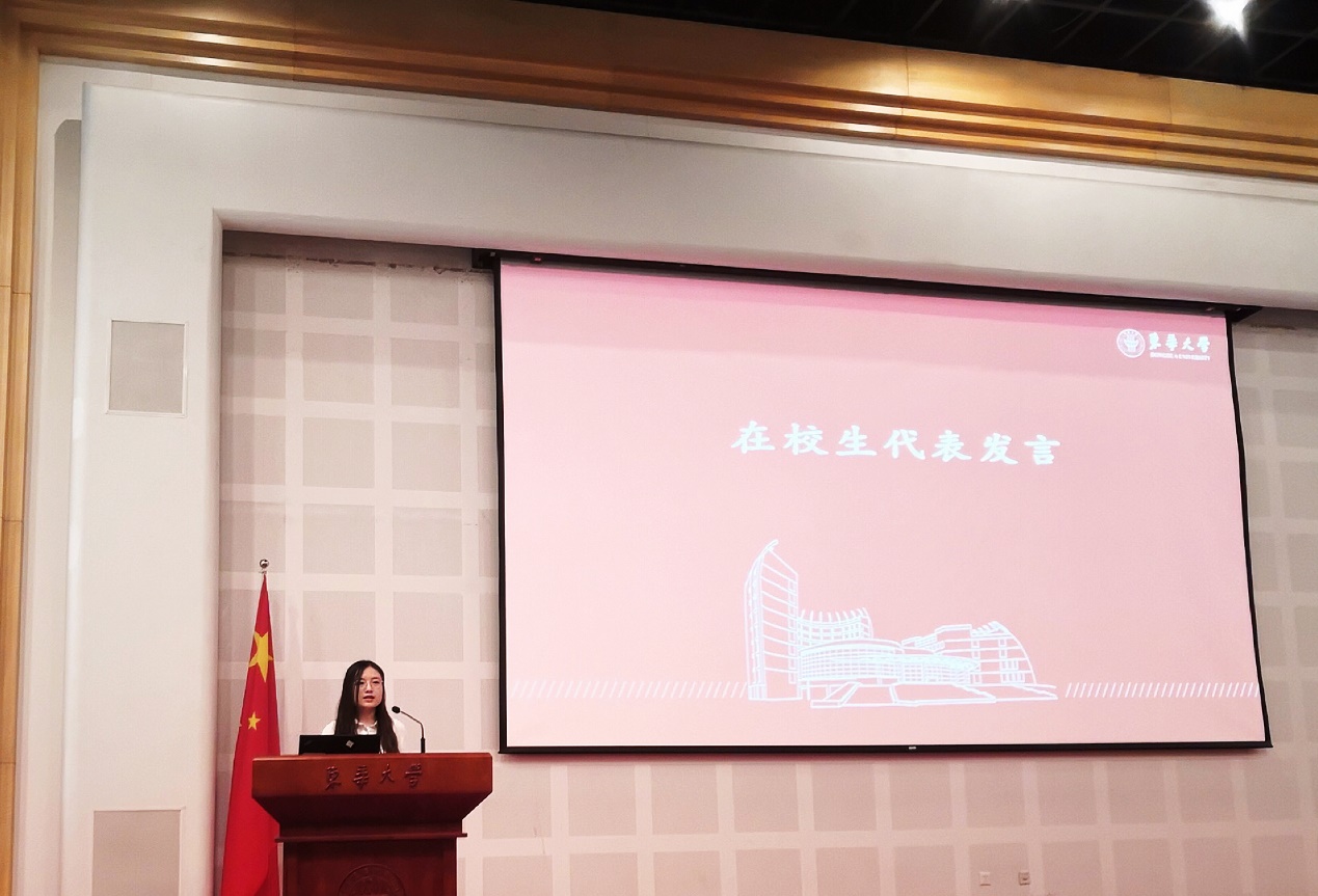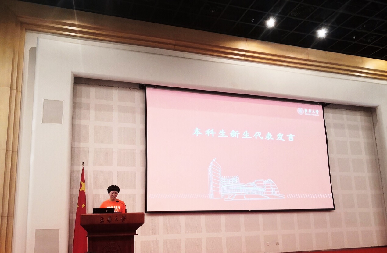 轻化(中德)1901班马誉菡同学作为本科新生代表发言,她分享了初入大学、进入东华校园的真实感受,表达了对学生生活的美好憧憬,报效祖国的责任担当,并号召同学们在大学期间学会做人,学会感恩,学会做事和学会学习。