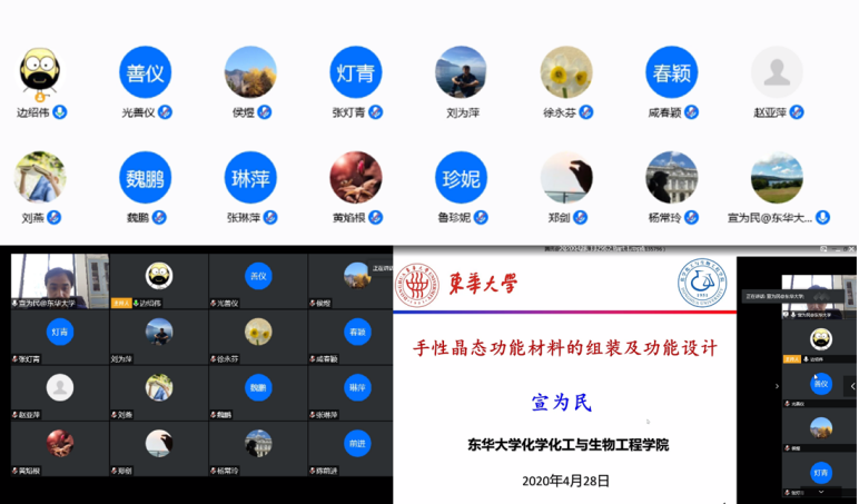 此次会议采用腾讯语音会议形式开展。首先由支部书记边绍伟老师介绍了学校在基层党组织和全体党员中开展“守初心、担使命,抗疫情,建设奋进东华”主题活动的重要意义。在此特殊时期,支部党员要深入贯彻习近平总书记在“不忘初心、牢记使命”总结大会上重要讲话精神,勇于担当,牢记使命,建设奋进东华,做好模范带头作用。支部将适时通过聘请支部内外优秀教师,充分利用线上交流平台,以学术报告、经验交流等多种形式分享教学科研经验成果,积极探索多学科交叉融合的有效途径,促进学院学科间交叉融合,带动学科发展。随后,支部党员宣为民老师向全体支部党员详细介绍了自己的国外和回国后在手性晶态功能材料方面的科研工作。通过介绍,让学院老师了解了这一领域的科研情况。侯煜、黄焰根、陈前进、张灯青、魏鹏和梁凯等老师与宣为民老师进行了深入交流讨论。