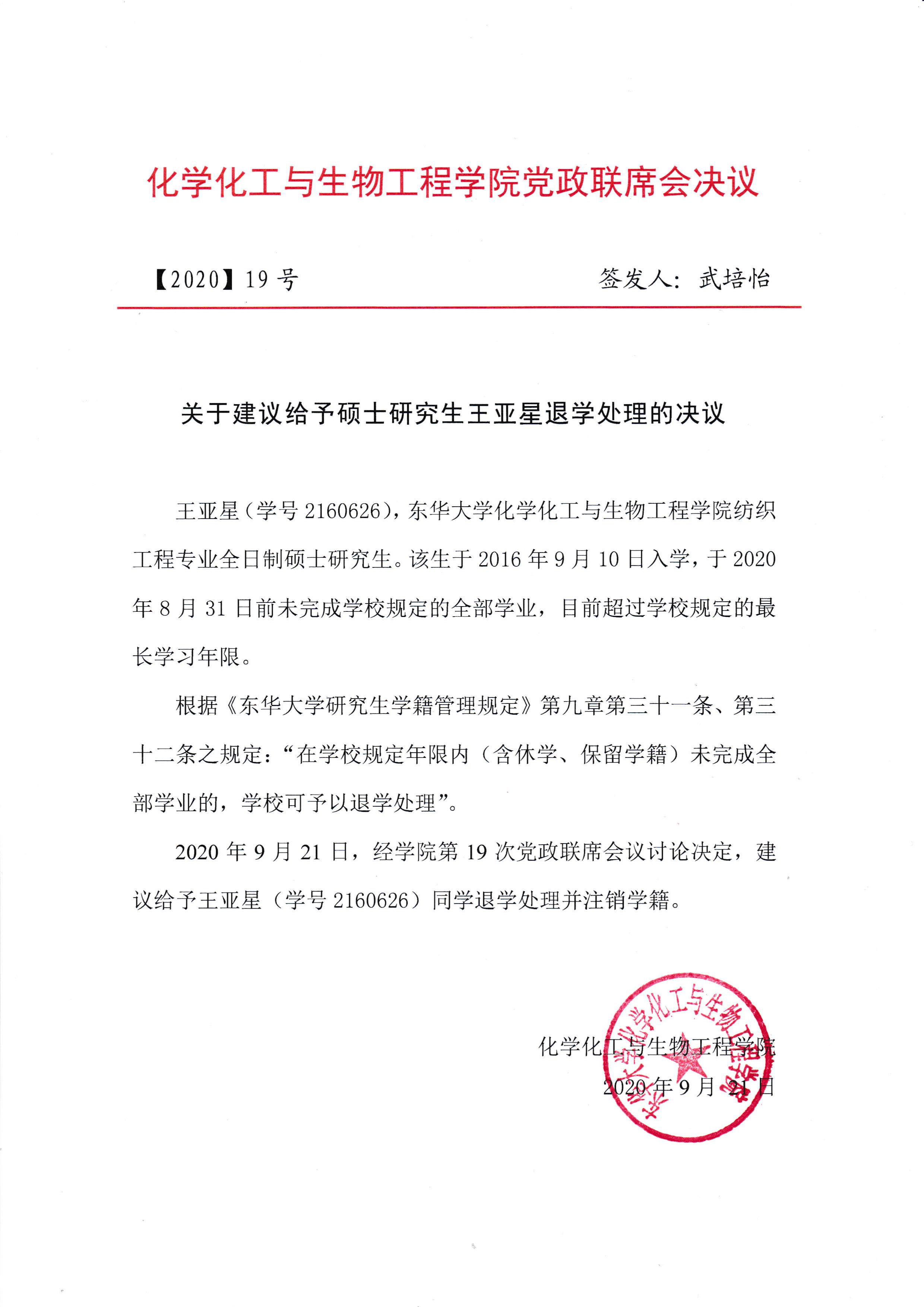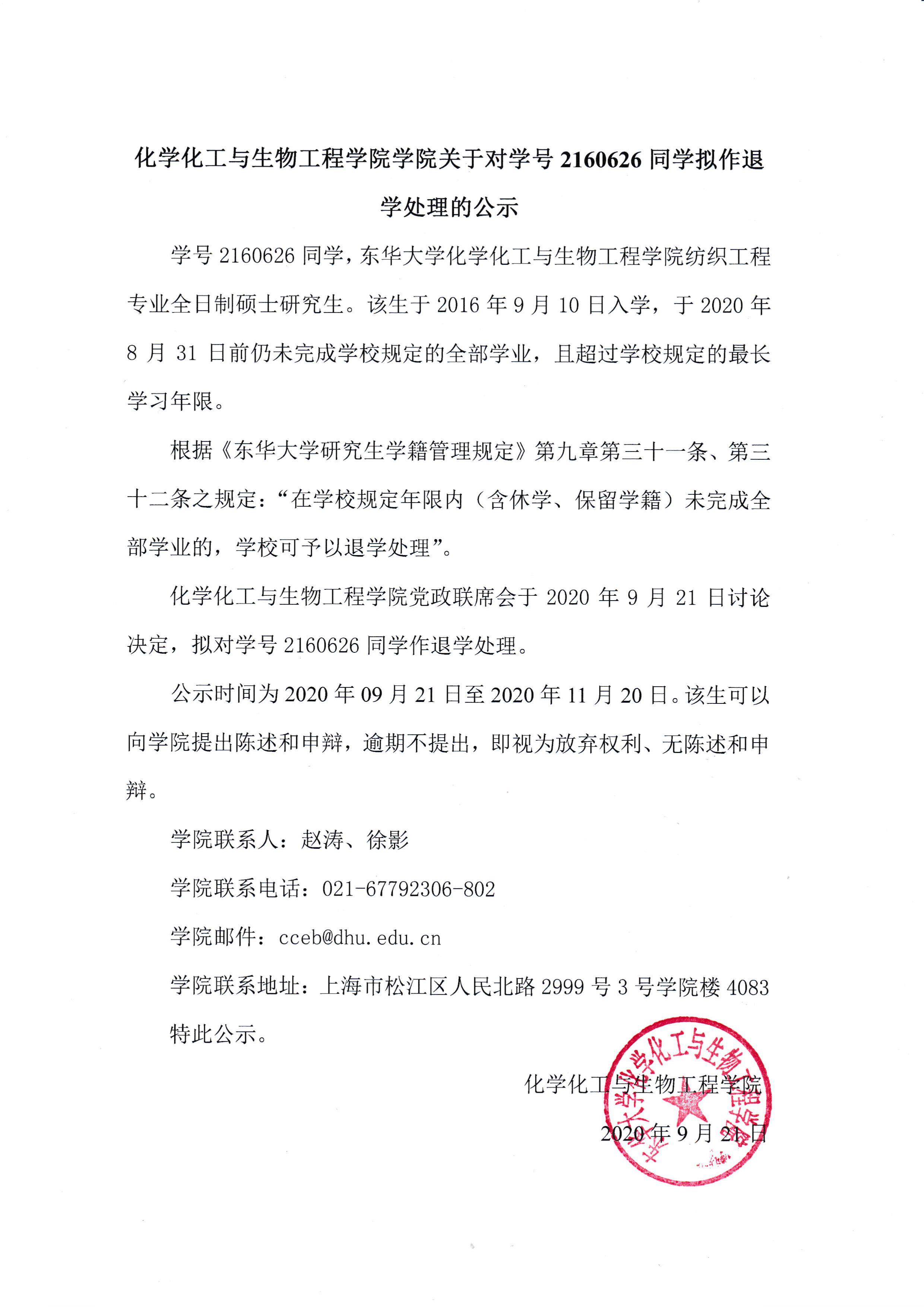 化学化工与生物工程学院学院关于对学号2160626同学拟作退学处理的公示