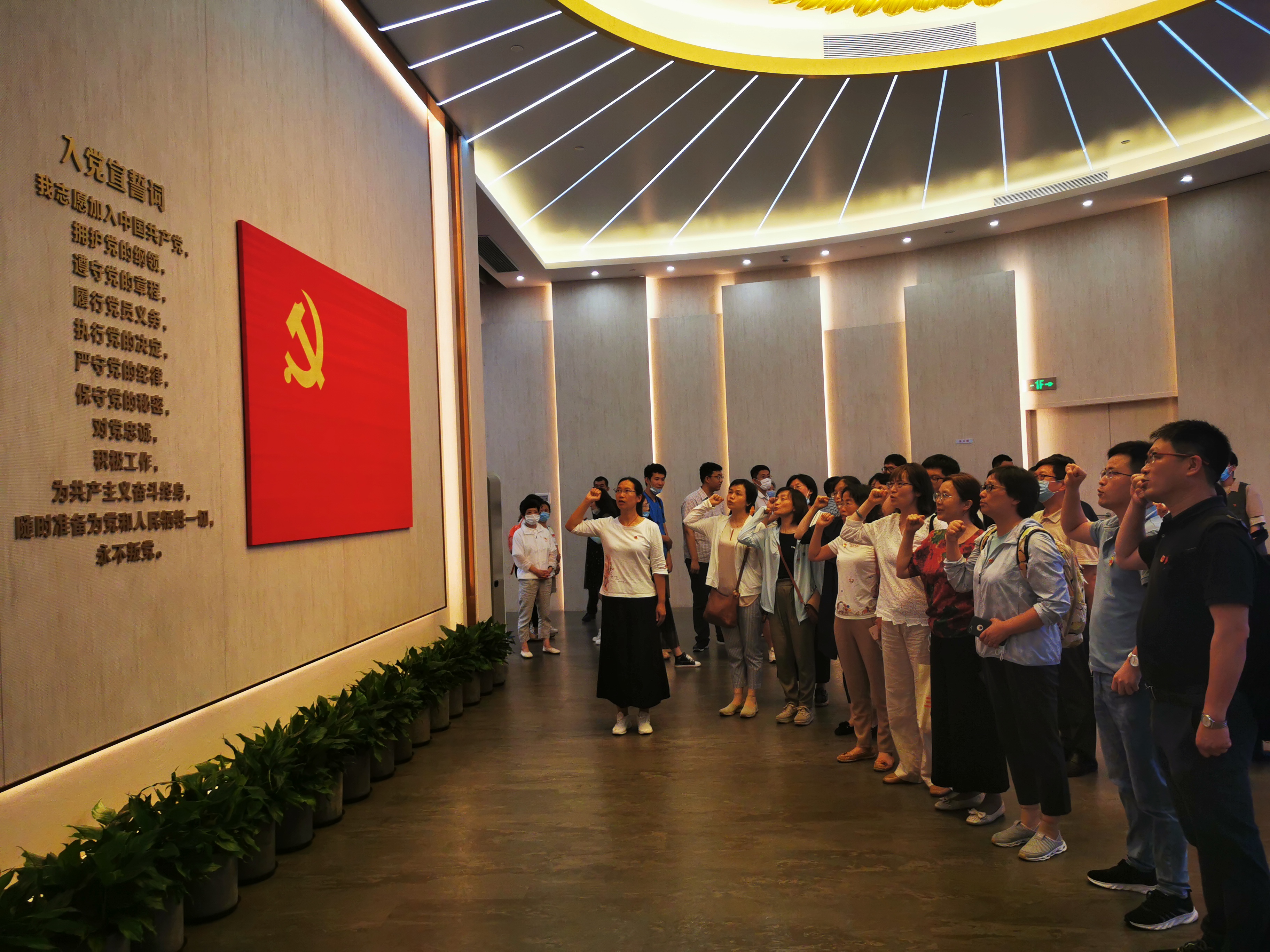 学院师生党员在讲解员的带领下开启寻访百年党史之旅。大家瞻仰了中共一大代表群像浮雕,参观了《伟大的开端——中国共产党创建历史陈列》序厅、“前仆后继、救亡图存”“民众觉醒、主义抉择”“早期组织、星火初燃”“开天辟地、日出东方”“砥砺前行、光辉历程”和尾厅等7个专题展区,详细了解了中国共产党为挽救国家和民族危亡进行的英勇斗争和艰苦探索。大家驻足在一件件展品前,感悟光辉历史,《共产党宣言》中译本、李白烈士修理电台的工具、《新青年》“马克思主义研究专号”等1000多件展品仿佛又带大家回到了那个风雨如磐的年代。下午3时,全体师生伫立在宣誓厅的党旗前,高举右臂,庄严宣誓“为共产主义奋斗终身”!鲜红党旗指引前进方向,铿锵誓言诠释不变忠诚。