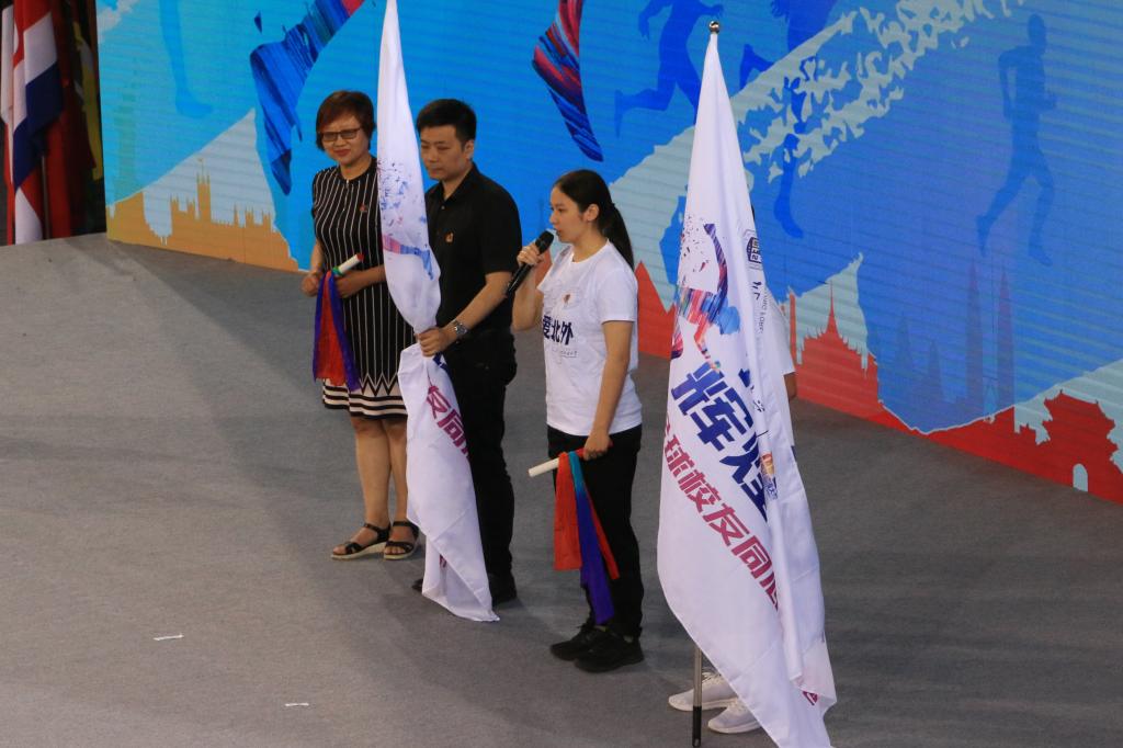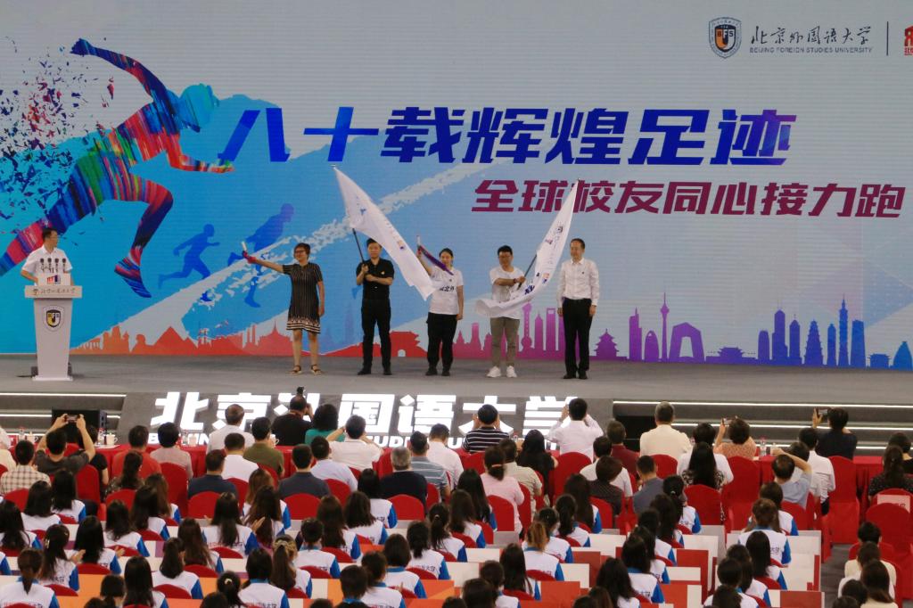 捐赠仪式后,党委副书记、副校长贾文键及众多知名校友共同启动“八十载辉煌足迹,全球校友同心接力跑”活动。买球体育官网卓悦同学作为留学生代表参与传递接力棒、接力旗环节。