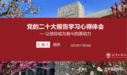 会议的第三部分,支部入党积极分子、买球体育官方网站青年教师代表顾苏分享了学习二十大报告的心得。她认为,二十大报告系统回顾总结了新时代十年的伟大变革,科学擘画了未来中国发展的宏伟蓝图,其中突出强调了教育、科技和人才的作用。作为具有鲜明“红色基因”的北外教师,我们应不忘初心、牢记使命,为党育人,为国育才,切实将二十大精神有机融入到教学工作中;发挥自身的学科优势,为构建中国特色的学科、学术体系以及话语体系添砖加瓦,把服务国家作为科研工作的最高追求。她结合个人参与庆祝中德建交50周年《中德大咖谈》节目录制的经历,认为外语教师应力求在大格局下讲好小故事,向世界发出中国声音。