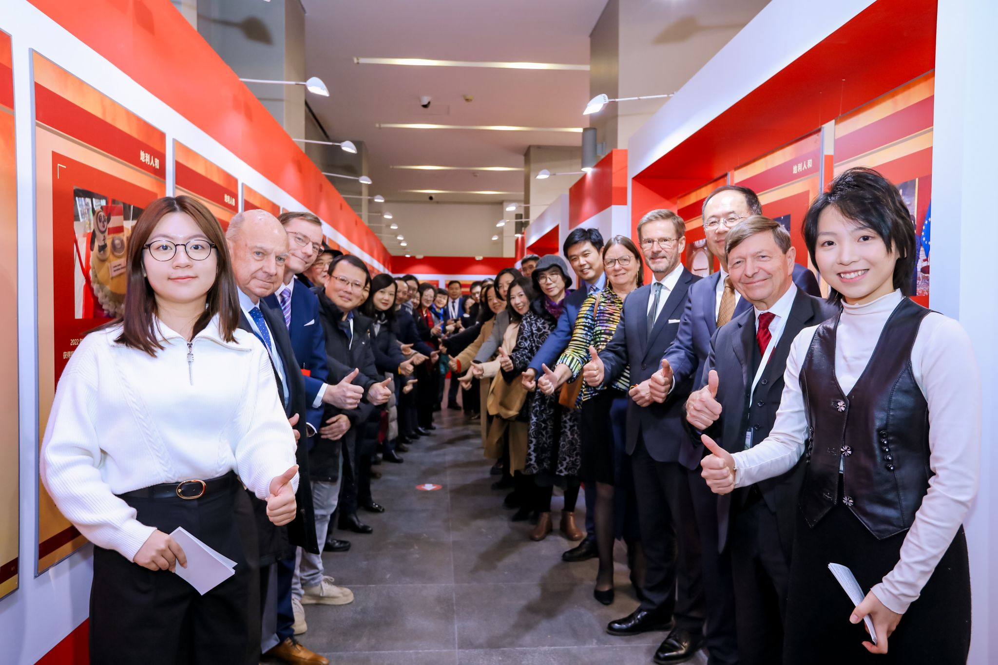 在热烈的掌声中,6位开展嘉宾手持金剪,共同为主题展剪彩。印制有结缘50周年标记的金色丝带寄托着美好的寓意,象征中奥人文交流开启下一个“黄金50年”。