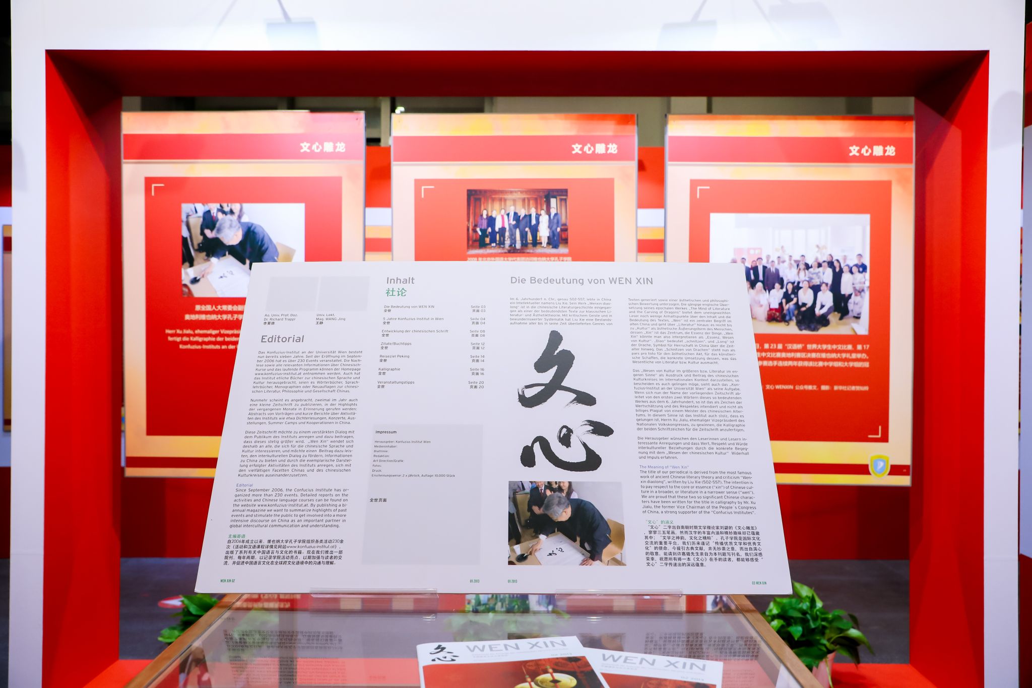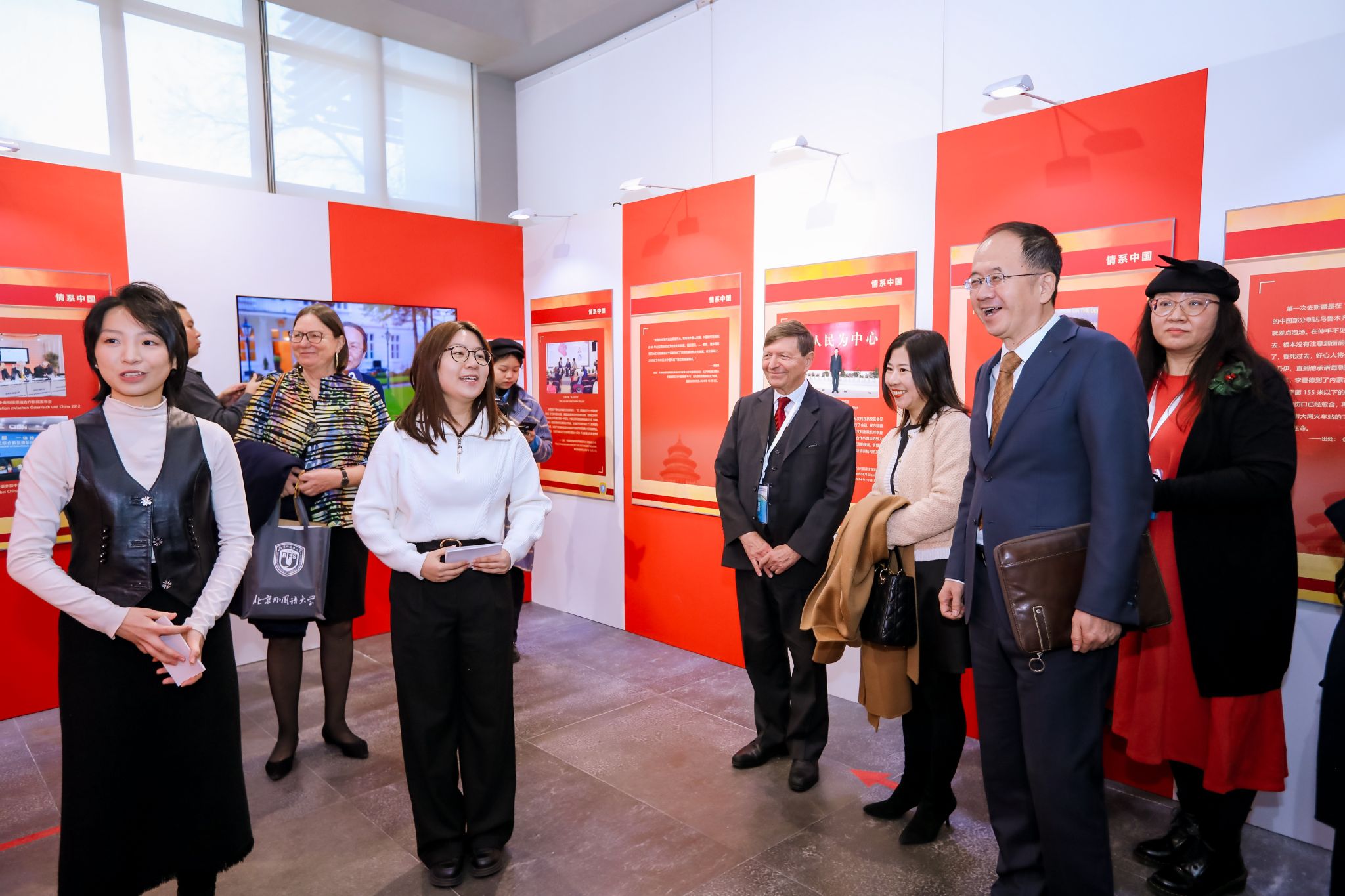 开展仪式结束后,嘉宾们在讲解志愿者北外买球体育官方网站2021级本科生刘晨曦、2022级本科生黄婉茹的带领下参观了主题展。主题展共分为三个板块。第一板块“情系中国”介绍李夏德教授与中文和中国的结缘;第二板块“文心雕龙”介绍李夏德教授对奥地利维也纳大学孔子学院建设作出的贡献;第三板块“地利人和”是聚焦中国与李夏德教授的故乡——奥地利1971年建交以来的重要篇章。买球体育官方网站学生流利的德语、丰富的知识储备以及昂扬向上的精神风貌给嘉宾们留下了深刻印象。