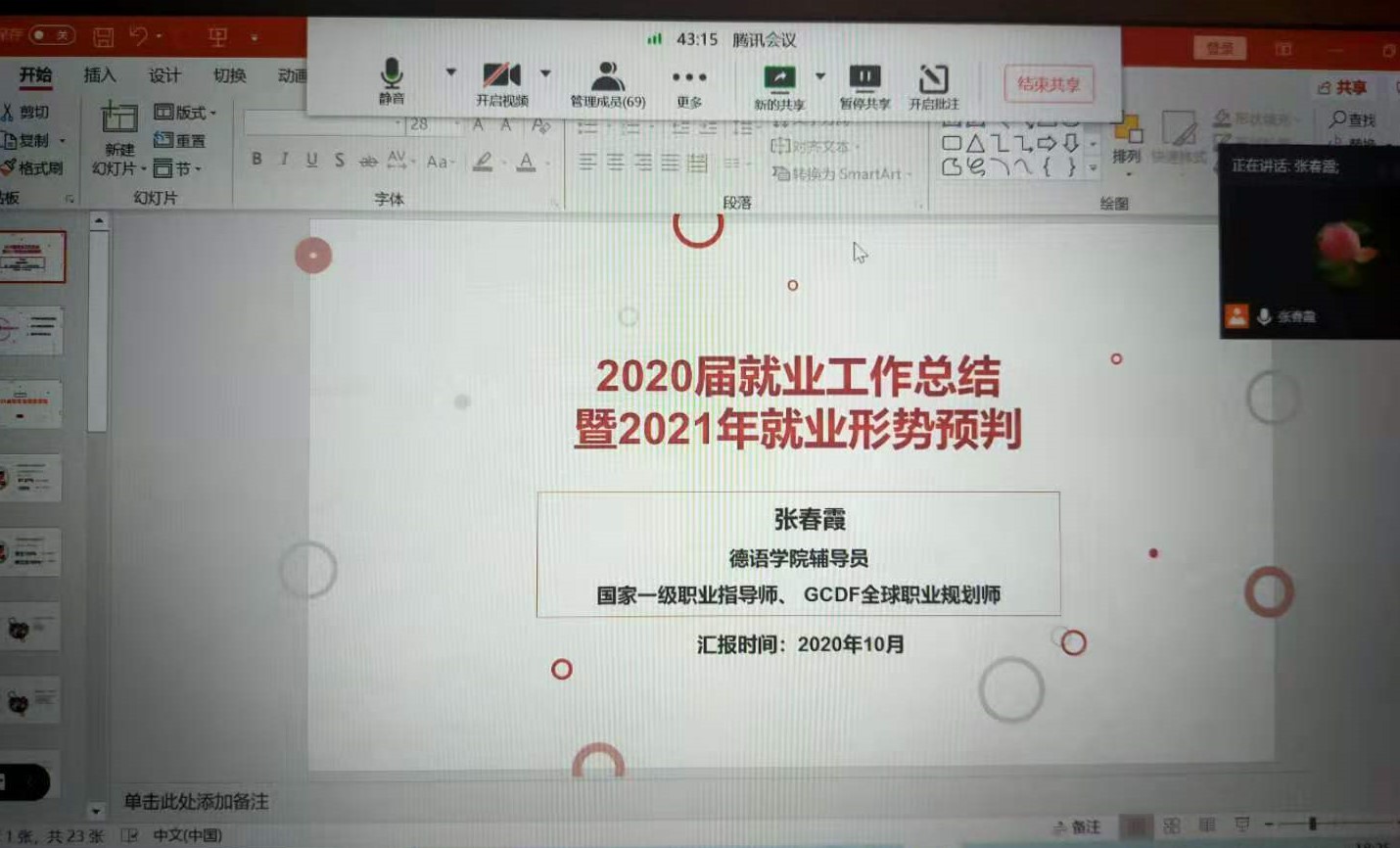 10月16日17:00—19:00,买球体育官方网站召开“2020年就业总结及2021年就业形势研判”线上会议。70余名研究生参加了会议。辅导员张春霞总结了买球体育官方网站近五年来研究生就业情况,分析了研究生的就业类型、就业行业、就业数据等,结合2021年高校毕业生人数、全国德语专业毕业生人数、目前秋招情况等对2021年的德语专业就业形势进行了分析和预判,对2021年的研究生就业进行了布置。