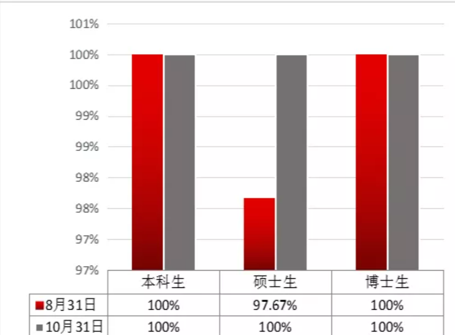 2019-2020学年,在学校党委的正确领导下,买球体育官网认真贯彻落实党中央和学校就业工作要求,探索全员、全方位、全过程的“三全就业模式”,师生同心,群策群力,攻坚就业难题。疫情期间,我们制定“抗疫情、促就业”工作方案,从“稳就业、清意向、扩领域、新方法、推实策、导方向”等六个方面,扎实开展就业工作。截止8月31日,本科生初次就业率为100%,硕博研究生初次就业率为97.67%。截止10月31日,本科生、研究生就业率均为100%,总体就业率为99.57%,居全校第二,比2019年毕业生就业率提升了15.26%。