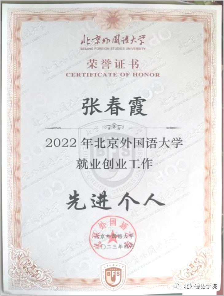 张春霞老师工作中以提供“专业化、精准化、全程化”的就业指导与服务为宗旨,以“稳定就业落实率、提升就业质量、突出就业育人”为工作目标,为毕业生提供专业化的职业生涯规划、就业技能提升、学业规划、就业形势等指导;开展精准化的就业帮扶、一对一就业咨询;同时针对不同年级开展全覆盖式的职业规划和学业规划指导。积极开拓买球体育官方网站毕业生就业市场,建设德语专业就业数据库,为2022届毕业生推送300余份就业信息,与多家用人单位保持良好合作。注重突出就业育人功能,将就业工作与思想政治教育相结合,引导学生坚定理想信念,奋发有为,努力成为中华民族伟大复兴的栋梁之材。