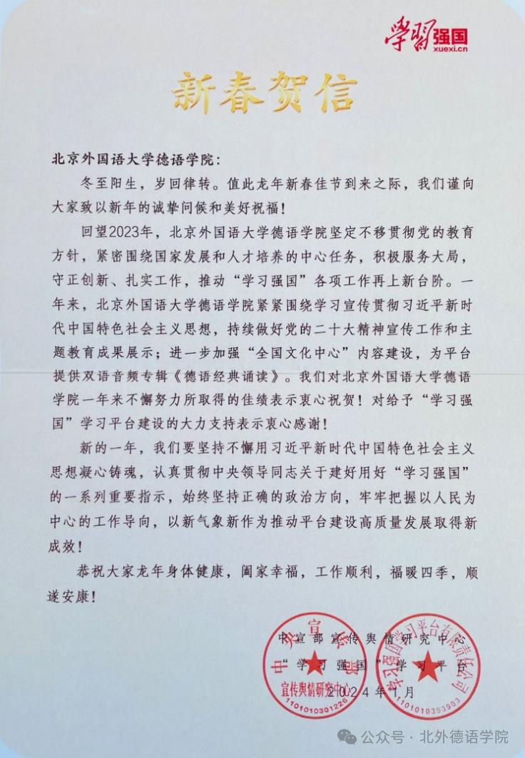 日月其迈,时盛岁新。新学期伊始,买球体育官方网站收到由中宣部宣传舆情研究中心与“学习强国”学习平台发来的新春贺信,对学院一直以来不懈努力所取得的佳绩表示祝贺,对其给予“学习强国”学习平台建设的支持表示由衷感谢。