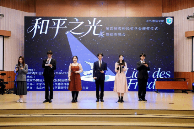 和平的薪火长明,点亮了逐梦的征程与希望。2025年11月2日晚,第四届荣裕民奖学金颁奖仪式暨“和平之光”迎新晚会于阿语楼国会厅隆重举行。本次晚会由北外买球体育官方网站主办,团总支学生会承办,在这秋意正浓的美好时刻,为学子搭建彰显风采的舞台,传递和平理想的温度。买球体育官方网站本科生方霖城、高浩童、李文婷、祁小涵、石宇凡和张婧琪六名同学共同担任主持人。