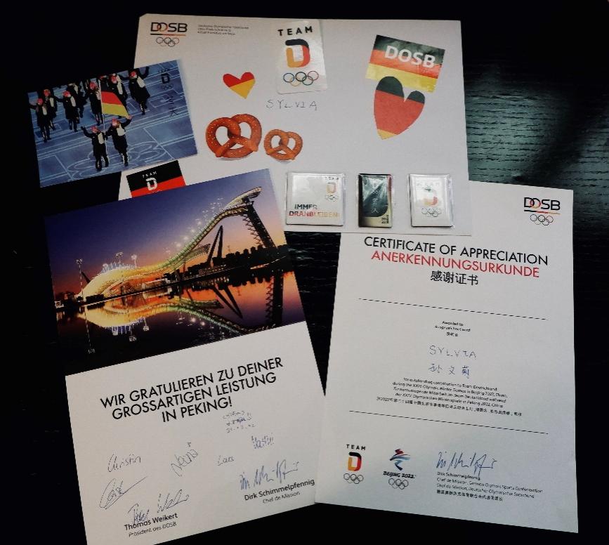 上岗近一个月的时间里,买球体育官方网站五位同学充分发挥北外人、德语人的专业优势,一方面高效协作,圆满地帮助德国代表团工作人员和运动员们解决了在冬奥期间遇到的各种难题,另一方面她们也牢记“讲好中国故事、传播中国声音”的光荣使命,在工作之余积极向德国代表团成员介绍中华文化,展现中国青年志愿者温暖热情、认真负责的形象,促进中德两国友好交流。五位同学的工作获得德国代表团的高度认可与充分肯定,冬奥会结束之际,她们均收到了来自德国代表团团长迪尔克·席梅尔普芬尼希(Dirk Schimmelpfennig)的感谢证书和表达谢意的珍贵礼物。