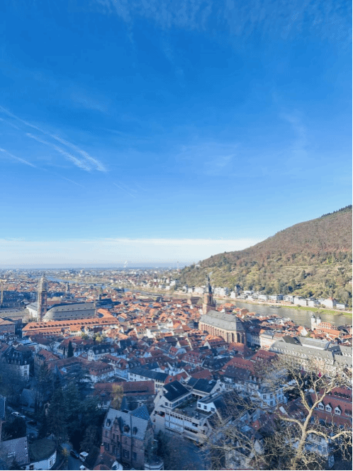 不知不觉间,时间已近中午。我们坐上了通往王座山山顶的小火车。海德堡的小火车是一大特色,木质的车厢带着一丝复古气息。随着火车缓缓向山顶前行,窗外的景色也愈加壮丽——内卡河蜿蜒而过,老城的全貌尽收眼底,而远处的群山连绵起伏,宛如一幅浑然天成的山水画。