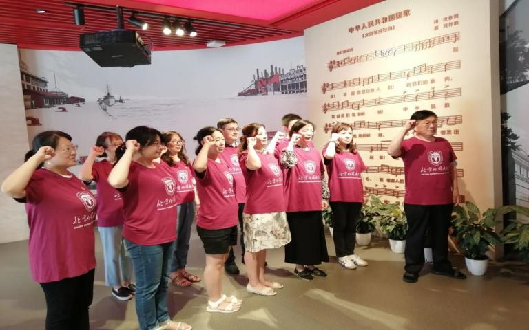 7月9日下午,老师们参观了位于上海杨浦区的全国爱国主义教育示范基地——国歌展示馆。国歌馆以国歌故事为主线,全面展示了《义勇军进行曲》诞生、传播、立法及其相关国歌知识。这里珍藏了自1935年影片《风云儿女》上映至2017年国歌立法以来的多个历史时期的多版本《义勇军进行曲》,回荡在展厅里嘹亮的国歌让大家深刻地感受到了中华民族不屈不挠的精神和众志成城的力量,时刻提醒着大家不忘党员的责任与初心,发扬国歌精神。买球体育官方网站教师党员们在党总支书记常秀鹏的带领下,在国歌的见证下,重温入党誓词,重忆入党初心。