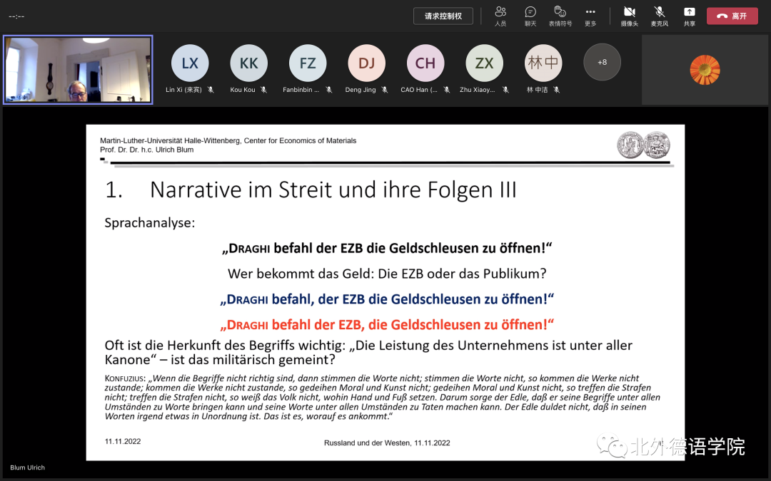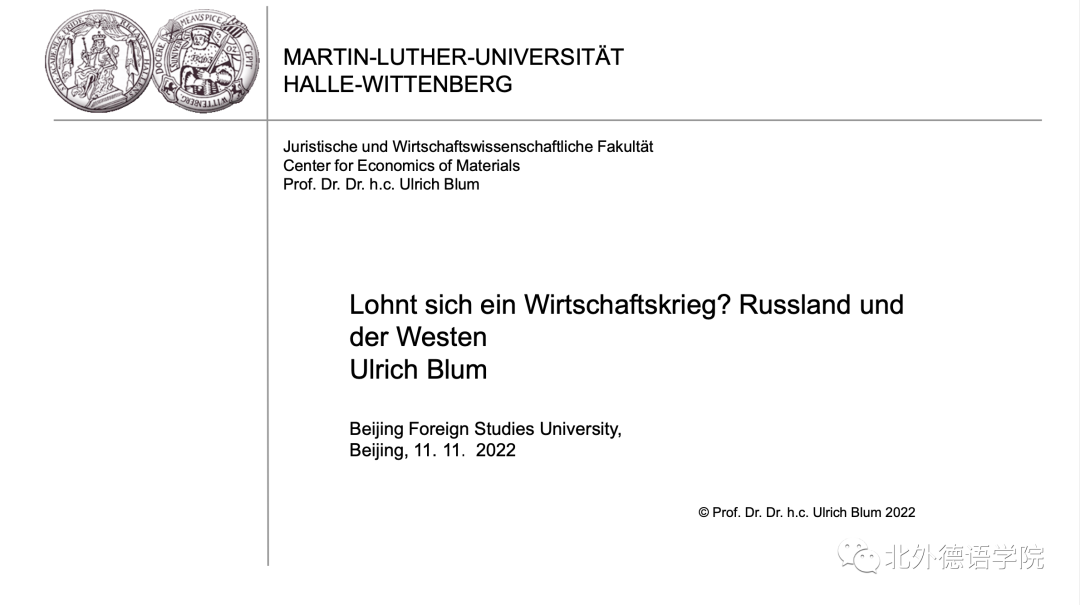 11月11日下午,德国哈勒-维滕贝格大学经济学院讲席教授、弗劳恩霍夫协会材料经济学中心创始主任、买球体育官方网站客座教授卜玉洗(Ulrich Blum)给买球体育官方网站师生线上做了题为“经济战争值得吗?俄罗斯与西方”的专题讲座。德国经济研究专题讲座由德国经济教研室主办,寇蔻副教授承担了本次讲座的主持工作。