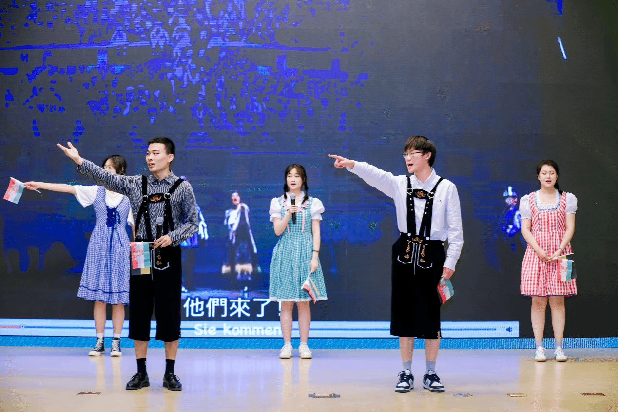 最后一幕“‘德’行致远”面向未来。舞台剧《未来已来,你在何处?》鼓励德语青年以坚定的步伐走向国际舞台。诗朗诵《万寿无疆》与啦啦操《家有德语》将师生情谊与青春风貌凝聚于舞台之上。两首德语童谣的温馨收尾,也唤醒了观众内心深处对童年的怀念与对初心的坚守。