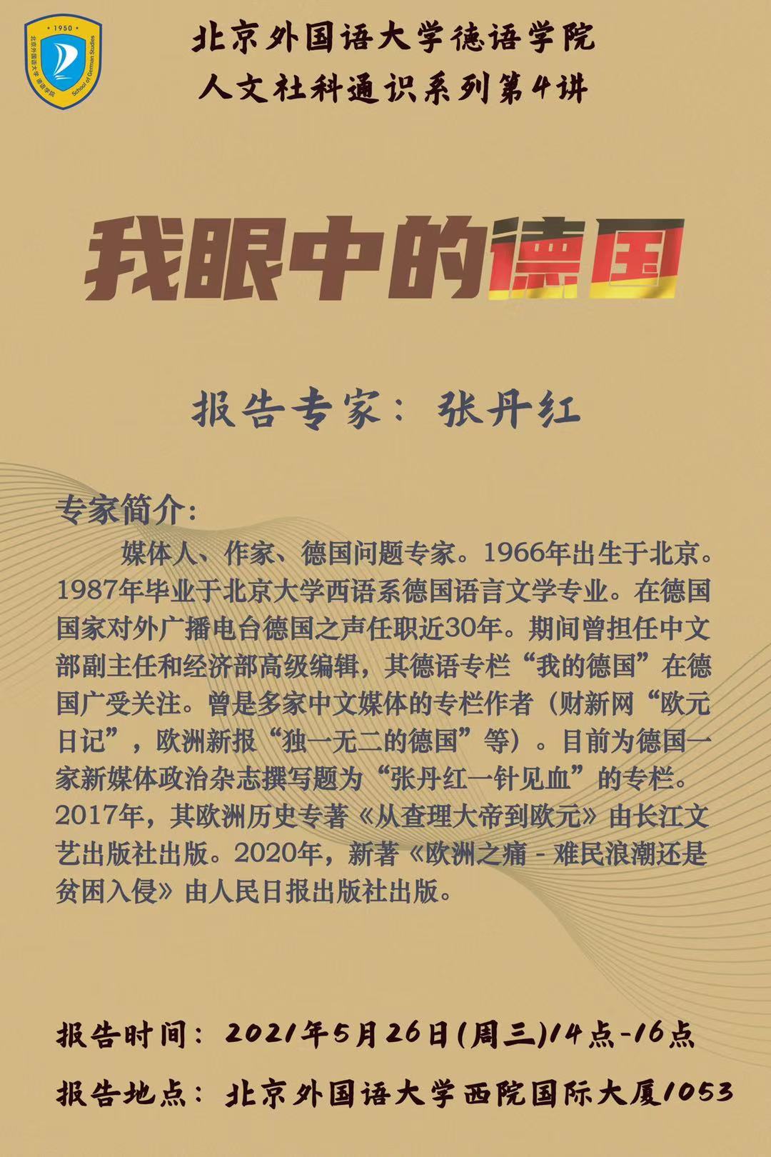 2021年5月26日下午,买球体育官方网站人文社科通识系列讲座第4讲在北外西院国际大厦1053会议室举行。资深媒体人张丹红女士应邀作了题为“我眼中的德国”的讲座。讲座由买球体育官方网站院长吴江主持。