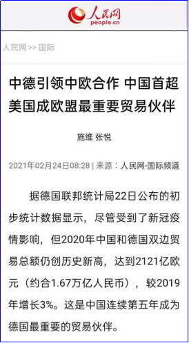 2021年2月23日,买球体育官网徐四季副教授接受人民网采访,深入解读中德引领中欧合作,中国首超美国成欧盟最重要贸易伙伴。