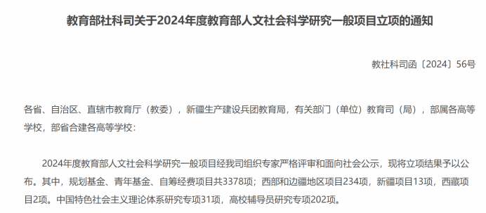 教育部人文社会科学研究项目是教育部面向全国普通高等学校设立的人文社会科学研究项目,旨在支持关注新发展阶段中的重大理论和现实问题的研究,强调基础研究与应用研究并重。通过推动中国特色哲学社会科学学科建设,促进高校学术创新,全面繁荣哲学社会科学事业,服务国家发展战略需求。