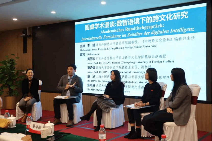 分论坛结束后,圆桌学术漫谈环节在北外买球体育官方网站副教授、《中德跨文化论坛》编辑部主任李婧的主持下进行。本次漫谈以“数智语境下的跨文化研究”为主题,邀请广东外语外贸大学西方语言文化学院德语系副教授黄羽欢,西南大学外国语学院德语系主任、副教授童诗倩,上海外国语大学中国话语与世界文学研究中心助理研究员童欣,武汉大学外国语言文学学院德文系副主任、讲师张申威,依次从经验性和展望性的角度探讨人工智能对跨文化交流研究的影响以及研究范式革新等话题讲述了个人心得,共同展望了数智时代跨文化研究的跨学科机遇与创新发展方向。