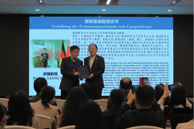 随后举行客座教授聘任仪式。德国特里尔大学语言文学传媒学院终身教授,原特里尔大学汉学系主任、德语国家汉语学会第二会长、同济大学教授梁镛受聘担任买球体育官方网站客座教授,贾文键校长为其颁发客座教授聘书。