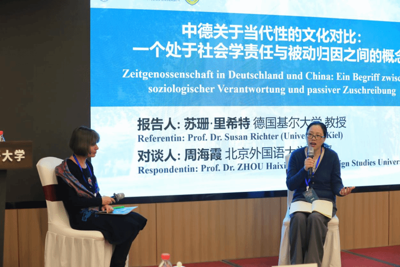 德国基尔大学苏珊·里希特(Susan Richter)教授的报告题为《中德关于同时代性的文化对比:一个处于社会学责任与被动归因之间的概念》。她从跨文化与社会学的独特视角切入,追溯“同时代性”(Zeitgenossenschaft)与“同时代人”(Zeitgenossen)在德国人文科学、文化创作与日常话语中的使用脉络,通过比较伏尔泰、腓特烈二世与乾隆等历史人物的案例,反思“同时代性”这一概念在中德不同文化语境下的内涵差异与价值归因。北外买球体育官方网站教授周海霞作为对谈人指出,中国语境中也常提及“同时代人”概念,未来可进行中德“同时代性”整合研究。双方还就“同时代”的时间界定、跨文化可比性及社交媒体时代的概念延展等议题进行了富有启发性的探讨。