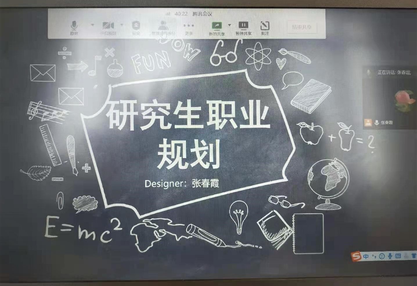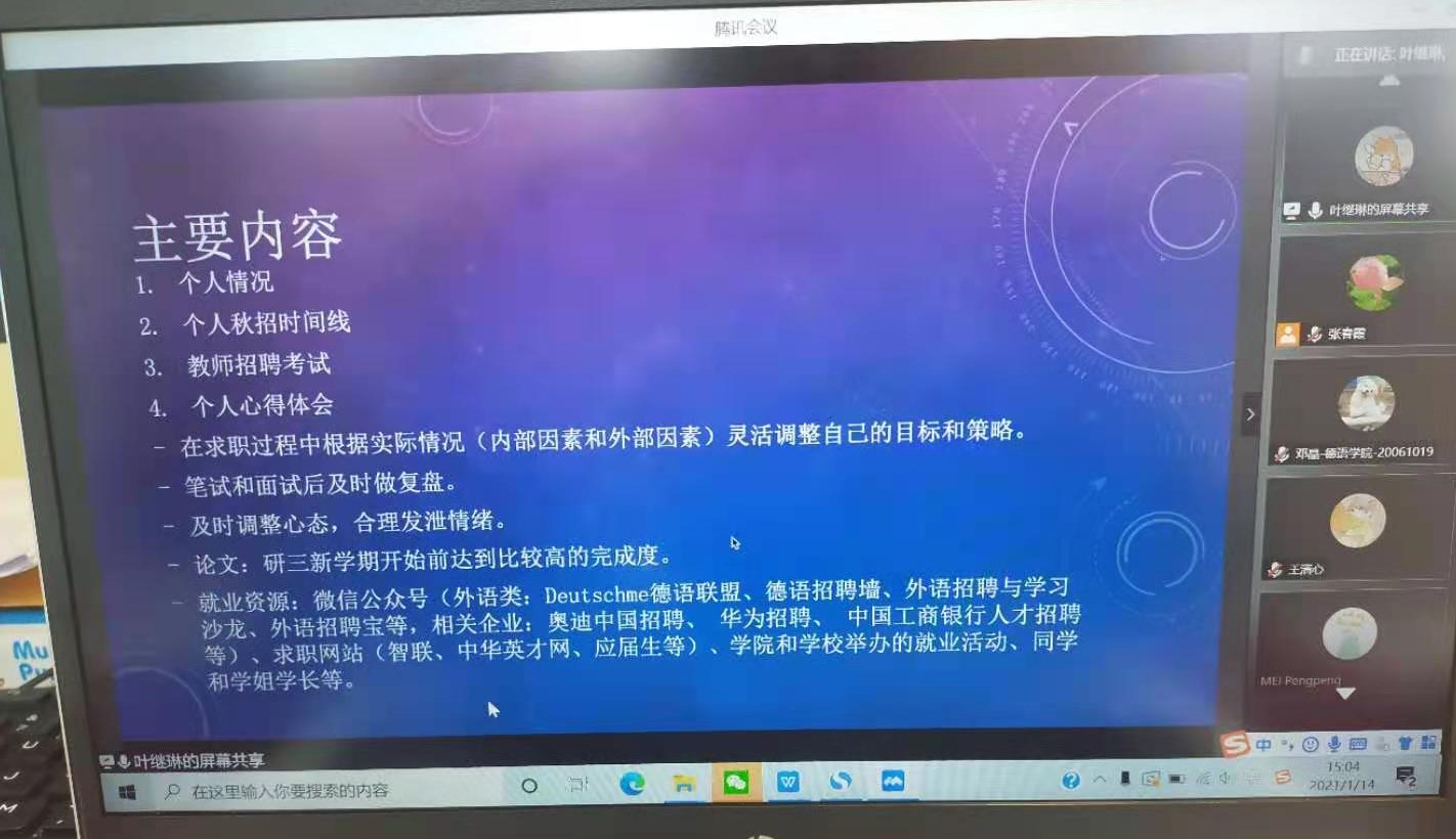 1月14日下午研究生期末会议,60余名研究生在线参加。会议邀请了研三学生张舶航、叶继琳、商健华进行经验分享。他们分别从研究生学业、职业规划,考博、求职经验等方面进行分享。之后辅导员张春霞作了研究生职业规划”的报告。张春霞老师首先介绍了2020年北外就业质量报告的相关内容,之后对2020届、2021届毕业研究生就业情况和就业形势进行分析,结合用人单位的反馈、毕业生的问卷等对研究生的学业、职业规划提出几点建议,并解答了同学们关于学业、职业等方面的困惑。最后对假期疫情防控、人身财产安全注意事项等进行了布置和要求。