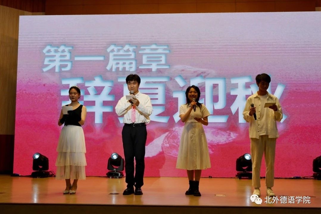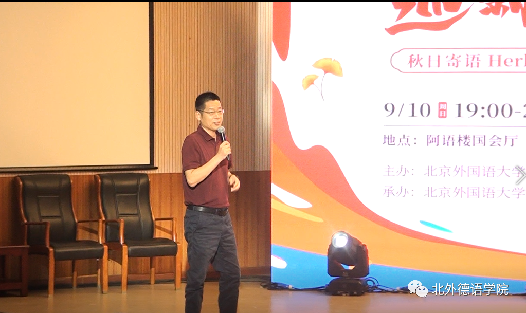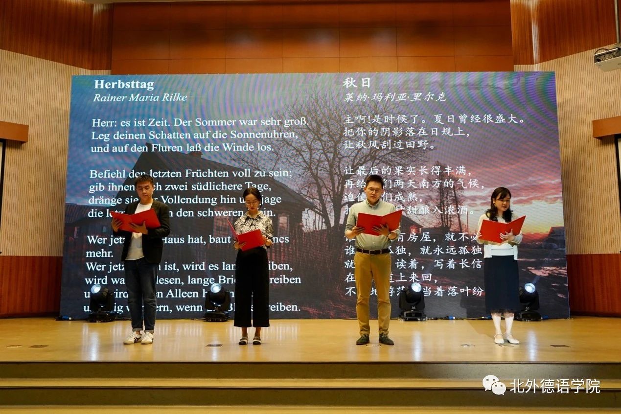 买球体育官方网站党总支委员、副院长张晓玲、寇蔻,青年教师武迪,22级硕士生姜浩远四人联袂表演中德文诗歌朗诵《秋日诗语》,朗诵了德国经典诗歌里尔克《秋日》、席勒《希望》和马克思经典著作《青年在选择职业时的考虑》(节选),使新生们感受到了德文之美、中文之妙,经典著作的隽永留香。