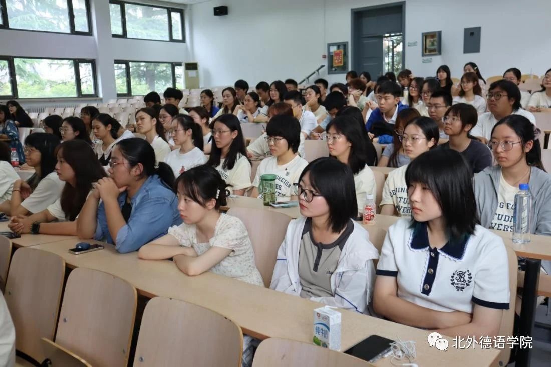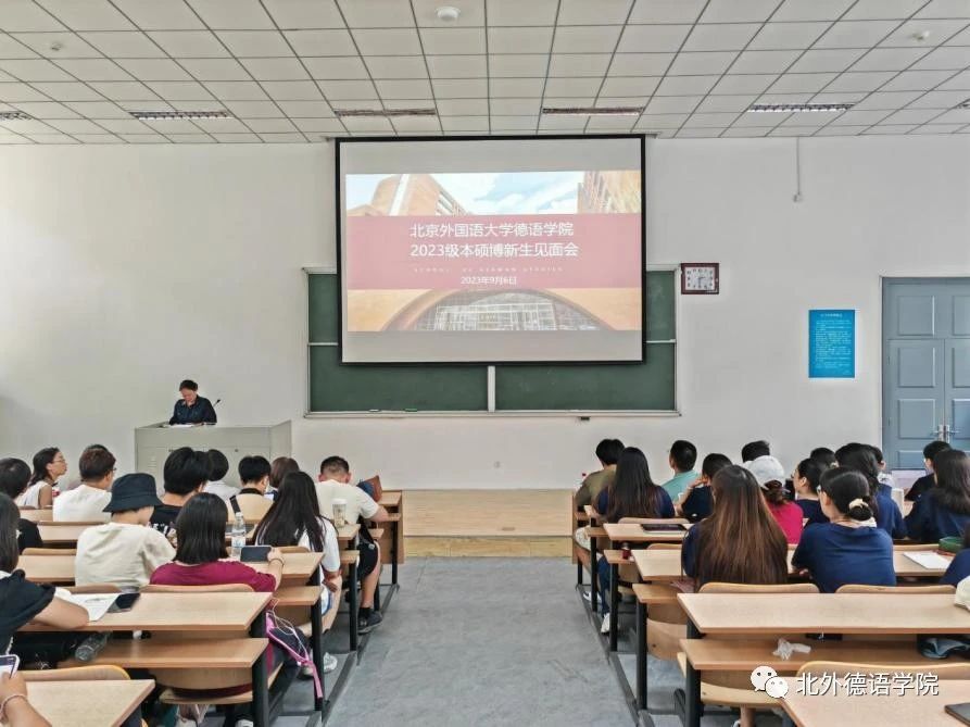 之后,学院党总支以及党政联席会成员先后发言。党总支成员、教学秘书于芳鼓励新生树立新的目标,努力实现梦想;党总支委员、副院长张晓玲、寇蔻勉励新生积极参与学院丰富多彩的各项活动,通过学习德语遇到更好的自己,认识更大的世界,用德语成就梦想,用梦想创造未来!党总支常务副书记李勇引用抗大校训“团结、紧张、严肃、活泼”,希望新生在大学宿舍生活中养成包容差异的生活习惯,搞好团结;在学院和学校的各种集体活动中,在各项校内外竞赛中,团结一致,共创佳绩。保持德语人严谨、认真和细致的好传统作风,勇创新、善突破。保持持之以恒、坚持阅读等良好的微习惯,遇见最好的自己。党总支书记、院长吴江借用汉字“熵”的由来以及管理学提出的实现熵减的三个路径,结合北外买球体育官方网站的发展史,勉励2023级本硕博新生保持开放的心态,学会与不同的学科和方向实现“能量交换”,敢于尝试创新远离稳态,秉持“兼容并蓄 博学笃行”的北外校训,开启在北外的晨读和暮思!