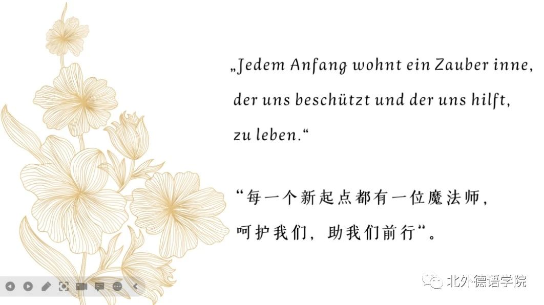 徐四季、李婧和陆娇娇作为教研室主任代表发言,勉励新生勇敢做自己,从北外出发,走向德语国家,在中欧交流的大舞台贡献自己的力量,祝福新生在北外沐浴四季阳光,播撒梦想的种子,合理规划好时间,充分培养兴趣与才干,不负韶华,静待花开;葛囡囡、史良作为班主任代表发言,鼓励新生寻找互帮互助的朋友,结识志同道合的伙伴,在模仿和超越榜样的过程中塑造出独特的自我;洪堃绿、武迪作为青年教师代表发言,祝福新生在北外买球体育官方网站度过充实美好的多彩时光,学有所成,开启行走世界的人生新篇章!包葛耿、邱袁炜代表学院行政工作人员发言,希望新生在北外的日子过得开心,每天进步一点点;辅导员张春霞、张婧、黄唯城勉励新生珍惜青春年华,勇攀学业高峰,敢于行走世界,秉承红色基因,成为又红又专又雅的北外德语人,承担起中华民族伟大复兴、构建人类命运共同体的重任。