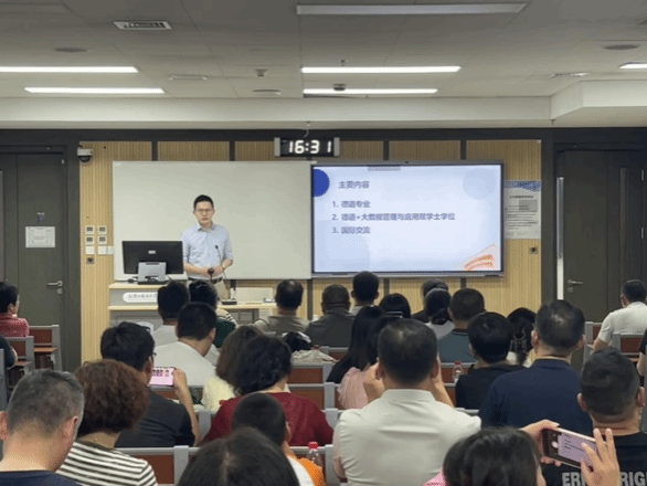 随后,买球体育官方网站党总支委员、副院长寇蔻聚焦本科人才培养,为家长们详细解读本科专业人才培养方案。他指出,学院正积极推动数智赋能本科教学,以科技助力教学质量提升。并围绕本科课程体系,分别介绍基础阶段的知识夯实重点与高年级阶段的课程设置,强调高年级选课体系“动态多元”的特点,满足学生个性化发展需求。寇蔻副院长还提及北外德语专业本科基础阶段教学改革成果,重点介绍《新经典德语》教材的应用——通过教材内容设计,引导学生用德语讲好中国故事,推动中外文明互鉴;同时梳理学院重要考试安排、各类赛事资源及选拔机制,为家长清晰呈现学生成长路径。此外,针对今年第一年招生的 “德语+大数据管理与应用” 双学士学位项目展开说明,从思政育人、课程育人、实践育人三个维度,介绍该项目的德语课程、大数据管理与应用课程及交叉融合课程设置;并围绕国际化人才培养,列举交流学习项目、海外实习实践机会、国外专家讲学讲座及高水平国际交流活动,展现学院为学生搭建的国际化成长平台。