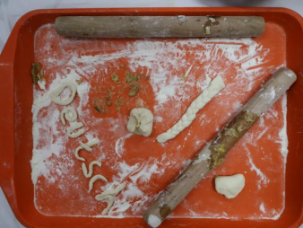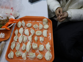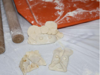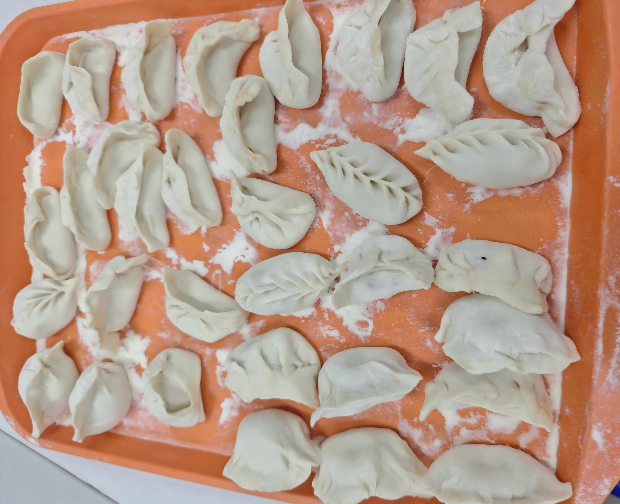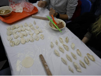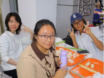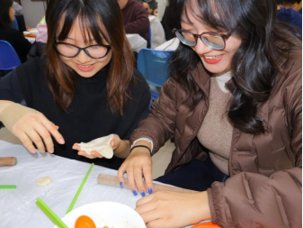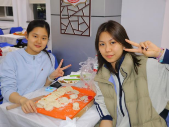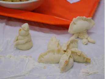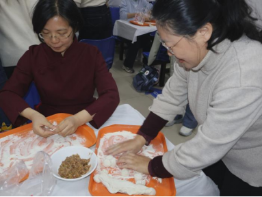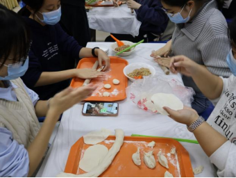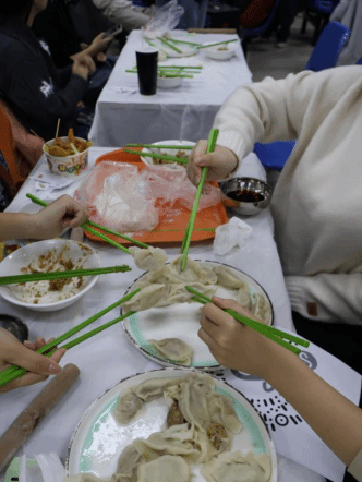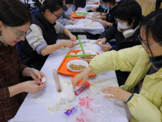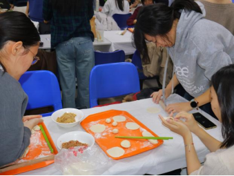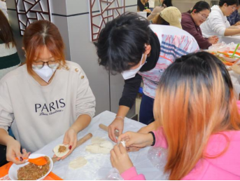 随着主持人一声令下,“最高效奖”争夺赛率先拉开帷幕。25 分钟的时间里,同学们组成的各小组分工明确、默契配合,擀皮、包馅、捏合动作行云流水。与此同时,吴江老师和张春霞老师默契配合,专注地擀皮、包馅,将一颗颗象征美好祝福的 “幸运红枣” 细心包入饺子中,动作娴熟又认真,默默为同学们筹备着惊喜。