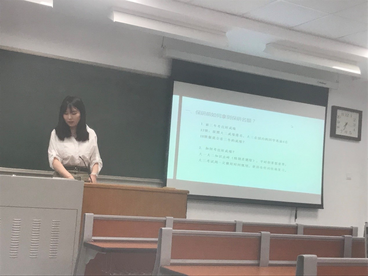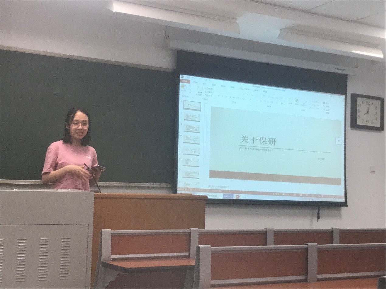 这之后,王文卓同学还分享了她准备考试期间调整心态的方法,并根据自己保研路上出现的问题和学弟学妹们分享了自己的经验。