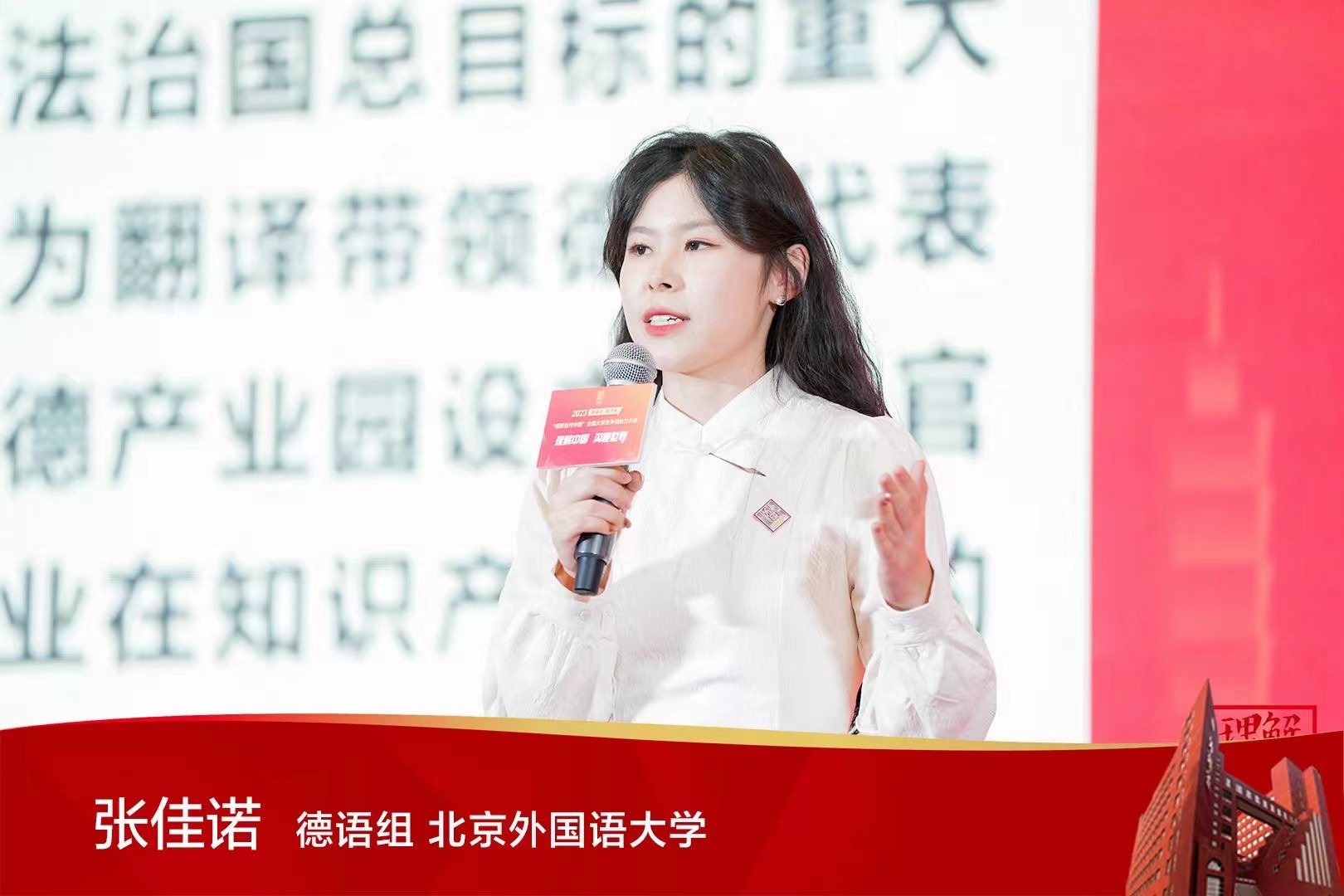 128日下午,大赛闭幕式设置了“多语种组冠军展示”特别环节,各语种国赛冠军用自己的参赛外语,结合学习经历与参赛所得,讲述自己理解中国、沟通世界的故事,展现当代青年的风采。张佳诺同学结合自己不久前带领德国代表团参观北京顺义中德产业园的经历,分享了自己从《理解当代中国》系列教材中学习到的中国依法治国理念以及中国法治建设成就的故事,获得一致好评。