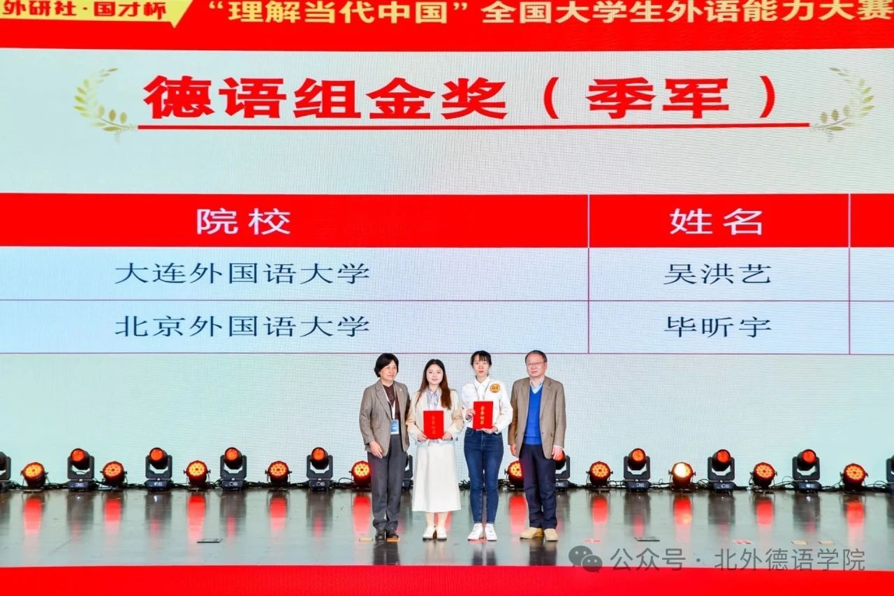 历经校赛、省赛、国赛第一轮和国赛第二轮四个赛段的激烈角逐,买球体育官方网站2022级本科生毕昕宇斩获德语组国赛金奖(季军)、北京市金奖;2024级硕士研究生孙硕荣获德语组国赛铜奖、北京市金奖;2021级本科生杨茹涵、2023级本科生夏昀菎和2024级硕士研究生李欣琪荣获北京市银奖。买球体育官网徐四季副教授和张晏副教授获评优秀指导教师。