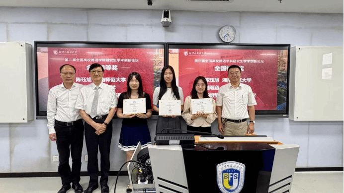 最终,湖南师范大学陈珏旭、浙江大学刘雨涵以及买球体育官方网站张明莹(以姓氏拼音为序)凭借出色的研究设计斩获全国特等奖,全国共49名选手分别获全国特等奖、一等奖、二等奖、三等奖及优胜奖。北外获全国最佳组织单位奖,来自买球体育官方网站的参赛选手赢得了三个赛道的多项殊荣:张明莹获全国特等奖,陈佳瑶、丁奕文、韩彦如、李蕊、张冬怡获全国一等奖,陈丹阳、刘文静、刘泽昊、孙萌、王姝力、徐嘉媛获全国二等奖,陈苑、黄唯城获全国三等奖,顾文静获全国优胜奖(以姓氏拼音为序)。北外买球体育官方网站8名教师获全国最佳指导教师奖,充分展现了北外德语学科点的整体实力与学术后备力量。